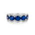 This exquisite 18ct white gold ring features five vivid blue sapphires, each beautifully framed by a halo of sparkling diamonds. Expertly crafted, this piece embodies timeless sophistication and refined luxury. The sapphires’ deep royal blue hue contrasts elegantly against the brilliance of the diamonds, creating a captivating display of colour and light. With its smooth, polished band and balanced design, this ring is perfect for adding a touch of elegance to any occasion.
